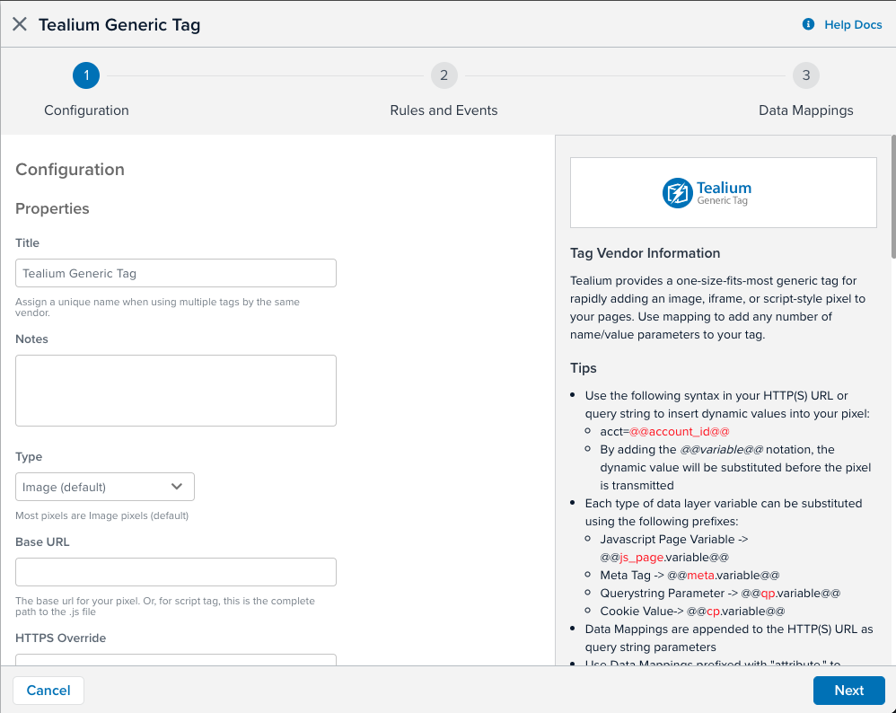 Symbiosys requires two types of data: Page Views and Orders. We’ll use two separate tags in Tealium to handle the collection of these data. For tags not already supported in the Tealium Tag Marketplace, as in our case, Tealium has two options for implementing: Custom Container and Generic Tag. Here, we’ll be using the Generic Tag. This allows you to dynamically pass data from your Tealium data layer variables to Symbiosys.